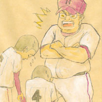 2007/11/30 Category : イラスト・デザイン お前らてんでなっとらん! Q=quick-tempertured 鬼監督本来は「キレやすい・怒りっぽい」という意味の単語です。顔が温度計みたいにみるみる赤くなっていく、まるでディズニーの演出みたいなイメージが湧いてきます。いいチームの条件として、いい監督というのは欠かせない存在です。甲子園にも多くの名監督がいらっしゃる。近頃ではただ厳しいだけでは生徒が付いてこないので、和気藹々とお友達のように接する監督が増えているようです。「鬼監督」という言葉が懐かしくなる時は、案外近いのかも。