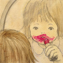 2007/01/10 Category : イラスト・デザイン おませさん このイラストは、作者の予想に反して人気があります。特に女性の方は共感してくださるみたいです。L-lipstick くちべに女の子がやりがちないたずら…本人はいたずらのつもりはないと思いますけど。私もやりましたが、たいていばれるのは、ちゃんと底の部分を回して口紅を引っ込められないでそのままフタをしてしまったときです。やわらかい紅の部分が、そのままフタにベタッと…。ママが気づいたときには大惨事です!しかもそれが、外国製の高級なモノだったら…この子も…どうやらこの口紅はGUCCIのようです!