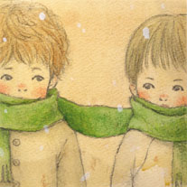 2007/01/02 Category : イラスト・デザイン あけましておめでとうございます! あけましておめでとうございます!今年もよろしくお願いいたします。K-knit ニット2人の子がマフラーを一緒にしているモチーフは気に入っていて、何回も色々な表現でチャレンジしてきました。この作品でやっとしっくりするものが描けたので、もう封印したいと思います。(笑)2人はちょっとけんかをしていて、でも寒いからマフラーを分け合っている…と、勝手に設定をしています。 PR