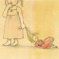 2006/12/05 Category : イラスト・デザイン A to Z イラストの続きを載せます! デザフェス関連でちょっと滞っていましたが、A to Z というシリーズの続きを載せていきたいと思います!D-dolly おにんぎょうdollyというのは、dollの崩した言い回しで、お人形ちゃんという感じみたいです。dog=犬を doggyって言うと、「わんちゃん」という感じになるのと同じかと思います。(うんちくっぽいぞ!)この絵の中では子供がお気に入りの人形を引きずり歩いています。人形はたまたま人の形をしているので、髪の毛を引っ張って引きずったりしたら、かわいそうだ!と大人なら無意識で思ってしまうことでしょう。でもそれは、さまざまな知識を得た大人の感覚であって、子供はそんなことお構いなしなのです。いつも肌身離さず持っているがために、たまには乱暴に扱ってしまうこともあるのでしょうね。とても子供らしい一面だと思います。