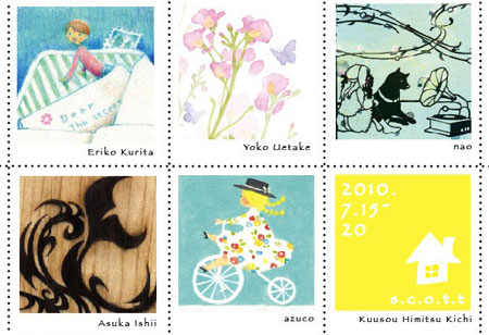 2010/07/01 Category : イラスト・デザイン 展示やります! 『空創ひみつ基地』展2010.7月15日(木)~7月20日(火)azuco 石井明日香 クリタエリコ nao ウエタケヨーコGallery S.c.o.t.t東京都中央区銀座7-7-1 銀座幸伸ビル B112:00~19:00(最終日17:00まで)久しぶりに、『空創ひみつ基地』でグループ展をやることになりました!いつもの仲間と、楽しい展示にできたらと思います。今回のテーマは『届ける』です。作品にちなんだポストカードや、切手(実際に使えます!)も販売予定です。どうぞ遊びに来てください☆7月18、19日には在廊予定です。その他にも在廊できそうな日があったら、またお知らせします。よろしくお願いします!